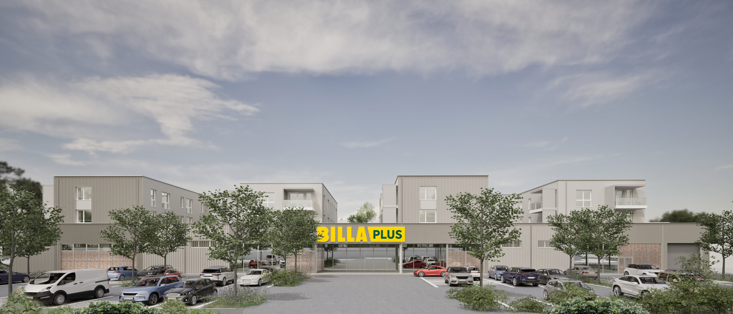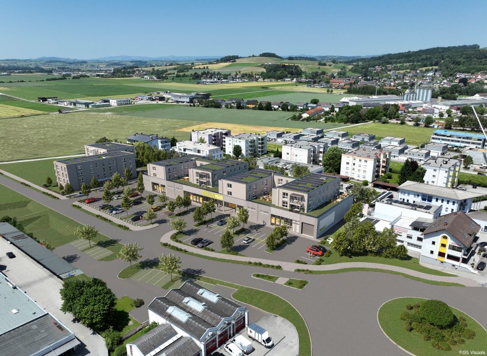 Die WSG geht neue Wege: In zentraler Lage in der Stadt Perg entsteht ein moderner Billa-Plus-Markt – überbaut mit 26 geförderten Mietwohnungen.