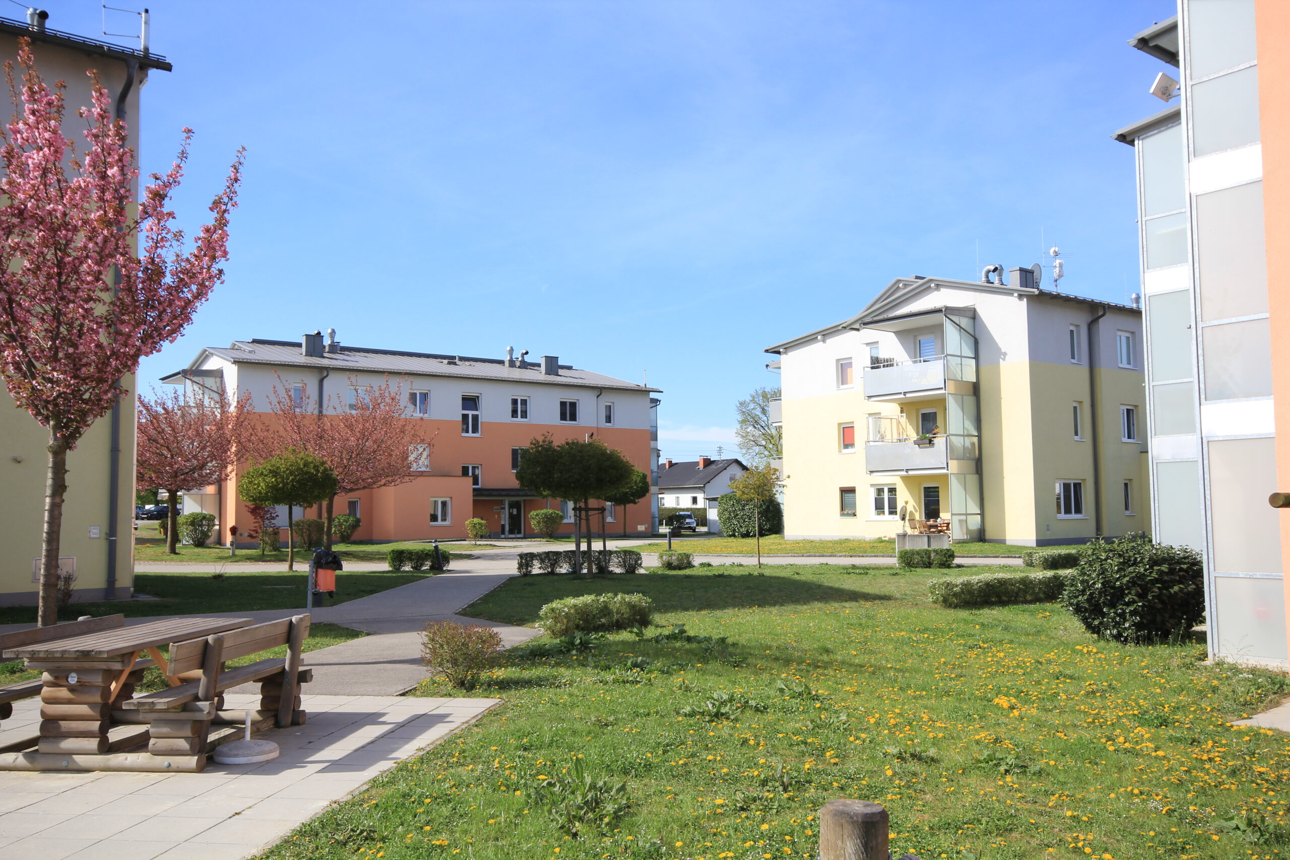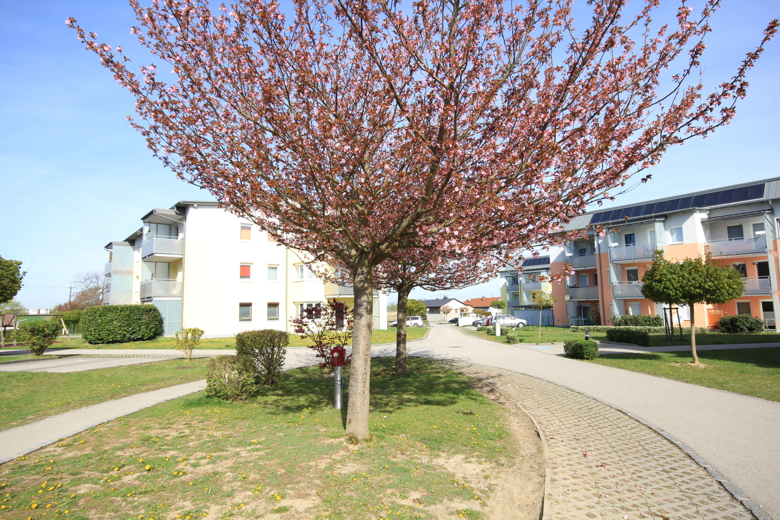 Besonderheit der Wohnanlage „Wehrgasse“ mit insgesamt 7 Wohnhäusern ist die an sich verkehrsfreie Erschließung mit dem „Platzl“ als Zentrum.