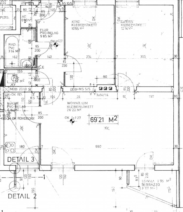 Die Wohnung besteht aus Wohnzimmer, Küche, Schlafzimmer, Kinderzimmer, Bad, separatem WC, Abstellraum, Flur, Kellerabteil und einer Loggia.